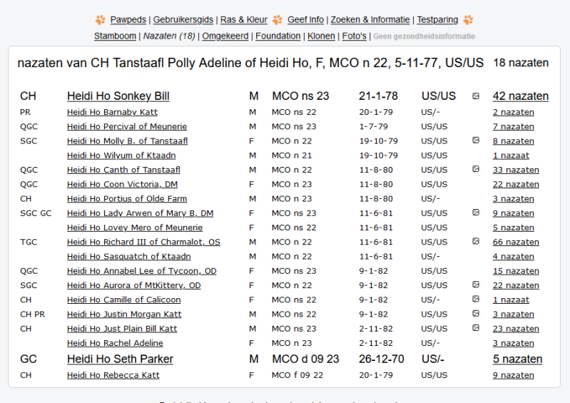 Wanneer deze twee katten met elkaar verpaard werden, bleken alle kittens ongeloofelijk hard op elkaar te lijken. De gelijkenissen waren zo sprekend alsof het leek of ze gekloond waren. Als we er dieper over nadenken is dit nu ook niet zo raar. Hun genen moesten vanwege de hoge inteelt voor een groot deel gelijk zijn. Zo werd de term ‘klonen’ geboren. Beide ouders kregen kampioentitels in shows en ook hun eerste opgroeiende kittens deden het erg goed. Hierdoor werden de klonen begin jaren 80 heel erg gewild. De voorspelbaarheid op toekomstige titels van de kittens, maakte hen heel aantrekkelijk voor fokkers. Polly en Sonkey hebben 7 nesten gekregen, daarvan gingen 17 kittens de fok in. Dus wanneer we het vandaag de dag over klonen hebben, dan spreken we over de 17 zonen en dochters van Polly en Sonkey. Hierbij een kopij uit PawPeds van de 17 katten: