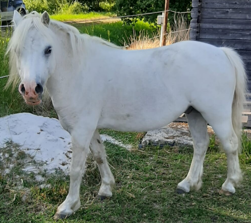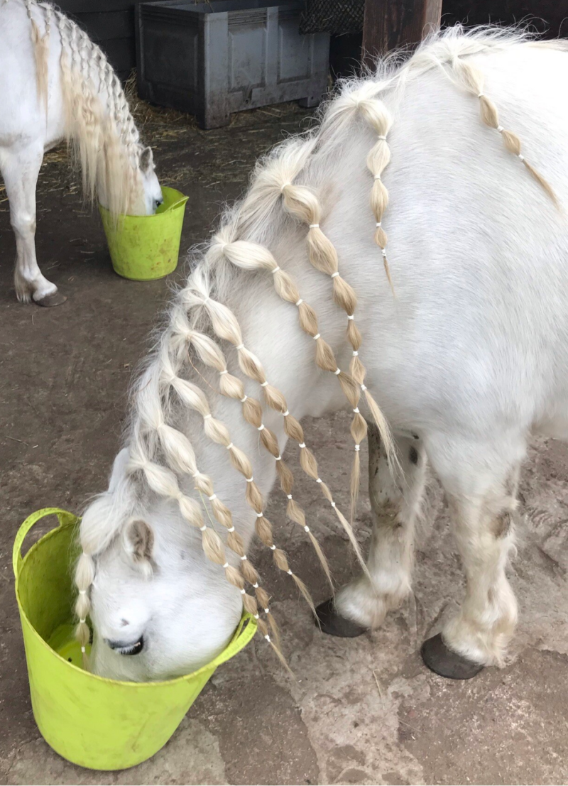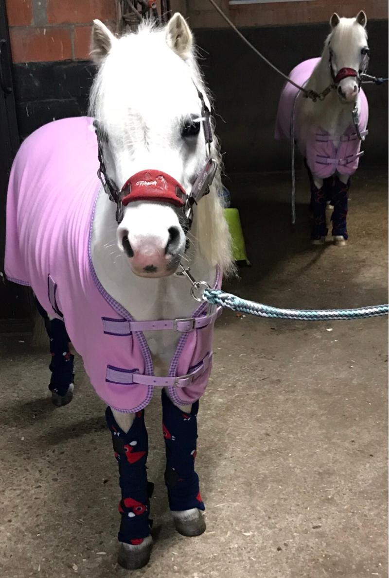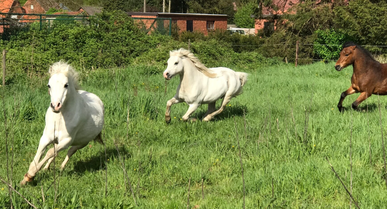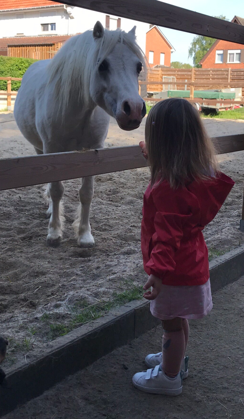 Na een half jaar bij mij, leek hij plots een aantal keren kort op elkaar koliek te krijgen (vermoedelijk) door hooi waar iets onzichtbaar mis mee was. De dierenarts probeerde thuis al het mogelijke te doen maar dat was niet voldoende. We deden hem naar paardenkliniek Equitom. Bij aankomst bleek hij een zware darmontsteking te hebben en werden de nodige behandelingen opgestart. Wanneer ze hem hooi gaven op de grond, begon hij plots na enige tijd te stikken! Met verschillende dierenarts werd 3u aan hem gewerkt om hem erdoor te krijgen. Hij werd door buisjes beademd. Bij onderzoeken de dag erna bleek dat de dierenarts thuis, zijn hoofdaders in de hals aan beide kanten in trombose (bloedklonters) had gespoten. Eten van de grond leek uitgesloten te zijn. Want wanneer hij naar de grond ging met zijn hoofd spande de aders zich aan rond de bloedklonters, was er geen doorbloeding meer en ging hij weer stikken. Ze deden in de kliniek alles wat mogelijk was. Wanneer hij na anderhalve week naar huis kwam heb ik gesmeerd met allerlei producten, gemasseerd en noem maar op. Een pony die niet meer van de grond zou mogen eten, is niet evident... gras groeit op de grond... Na 6 maanden gingen we op controle. In de kliniek zagen ze nog steeds duidelijk de klonters op de echo maar hadden ze het vermoeden dat er waarschijnlijk wel net voldoende doorbloeding was om hem eten te kunnen geven op de grond of te laten grazen. Uiterst voorzichtig en met grote schrik bouwden we het terug op... Maar het leek goed te gaan! Hij kreeg een jaar platte rust om volledig te bekomen van dit avontuur.